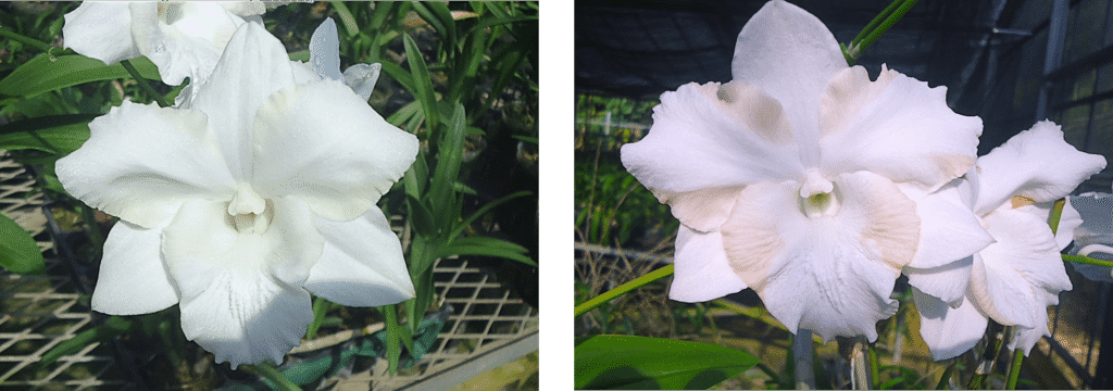 咲き始めはほぼ純白に近く、時間の経過と共に花弁の一部が色づき、最終的には桃色に近い色合いになります。