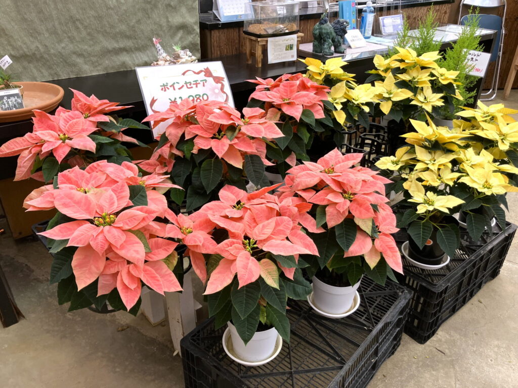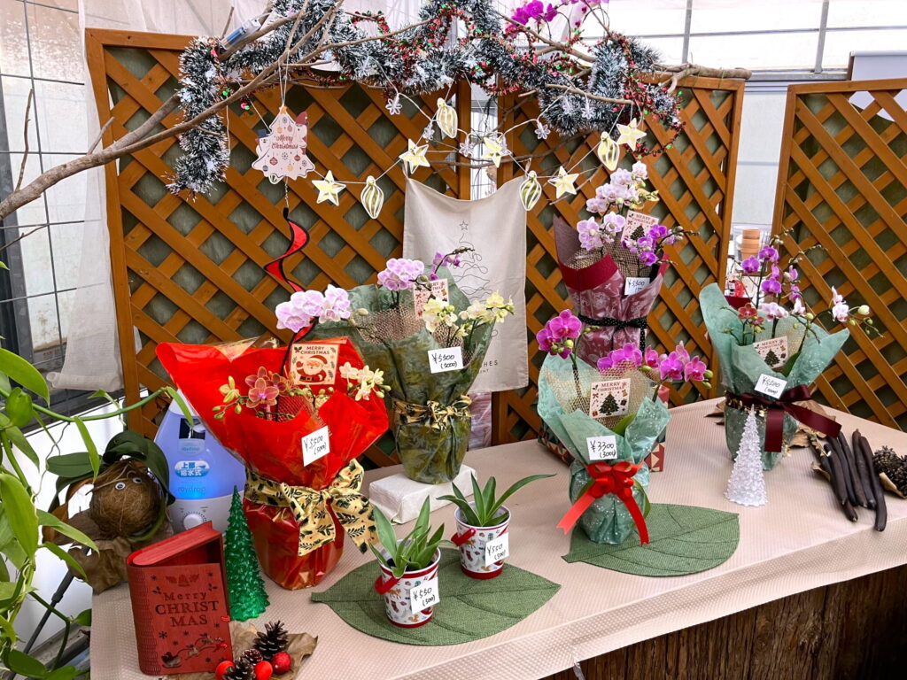 可愛らしいミニコチョウランや、ポインセチア、ゴールドクレストなど、