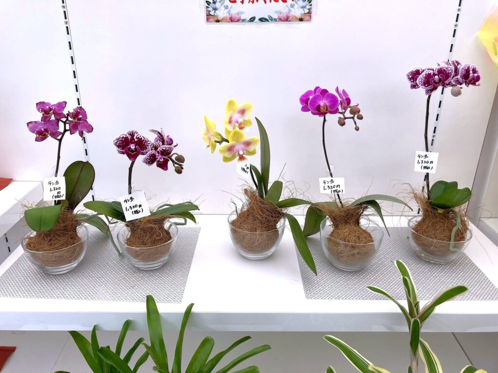 フラワーショップ蘭らんでは、可愛らしいミニコチョウランのラン玉が並んでいますよ~♪